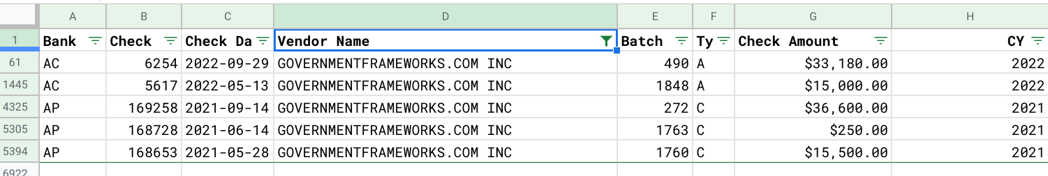 District 65 appears to have a contract with GovernmentFrameworks.com. They pay about $50,000 a year and over the last two years have paid $100,530.00. Below are the list of bills paid the last two years. They signed this contract sometime during the 2021 School Year, because they have no bills prior to 2021-05-28 from GovernmentFrameworks.com.