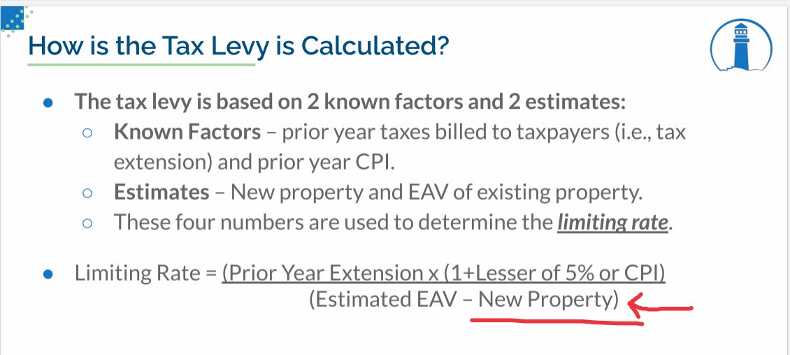 According to the Assessor’s Office, when a property onboards with HB 2621 at the 20% affordable housing level, the EAV increases are phased in over time. The first three years of the program feature a 100% discount on the new EAV. In those three years, this new building is basically invisible to local government when computing the tax levy. It is not in the total EAV and it is not in the “New Construction” part they can back out. It’s just invisible, as if the land was never improved.