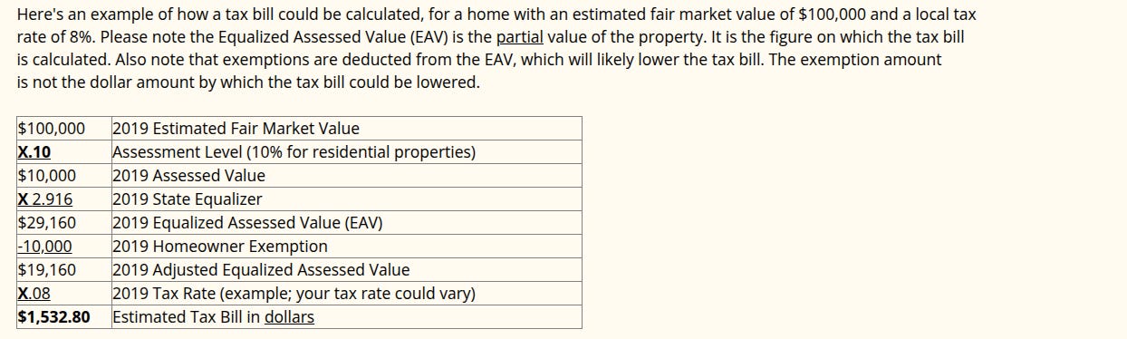 In Cook County, you elect a County Assessor, his name is Fritz Kaegi. His office keeps a list of every property. They track of the “Fair Market Value” for properties and then apply some modifiers to come up with a EAV (Equalized Assessed Valuation). The EAV is not the value of your property, but it’s some percentage of it.