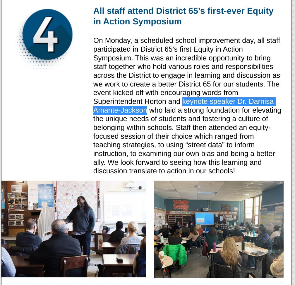 One of my readers was curious for the cost to the District for the keynote speaker that District 65 had at their full-day equity professional development session last Monday. Here is a snapshot from the District’s email on the subject: