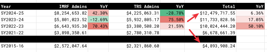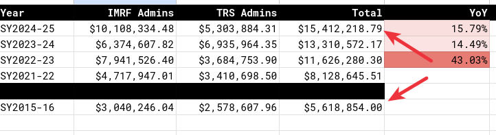 For example, in 2015-16, there were 5 non-principal administrators making over $150,000 per year and today there are 10. They also seem to juggle people between pension funds - I donāt know why that is - please comment if you know.