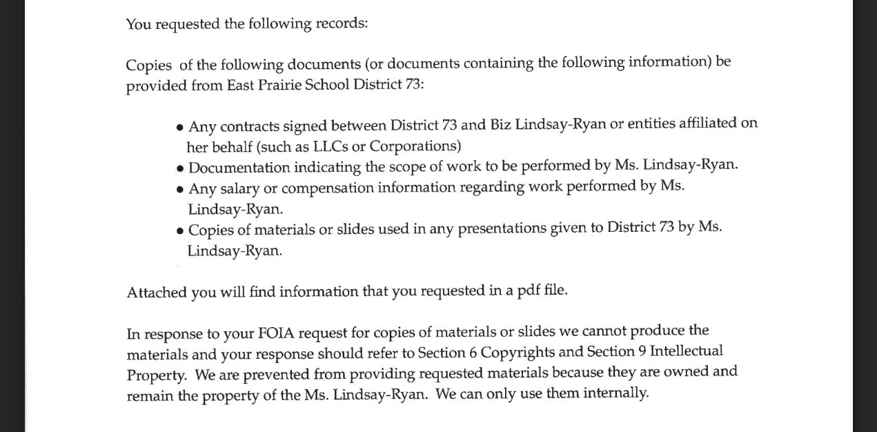 This very issue has stymied my research a few times. For instance, I submitted a FOIA to District 73 for records related to the training offered by Biz Lindsay-Ryan, an Evanston School Board member. I believe it is in the public interest to have transparency into the things our elected officials are saying while being paid by neighboring districts. It is in the public interest to know: Is she using materials generated by paid employees of District 65? Is she discussing District 65 or her role therein?