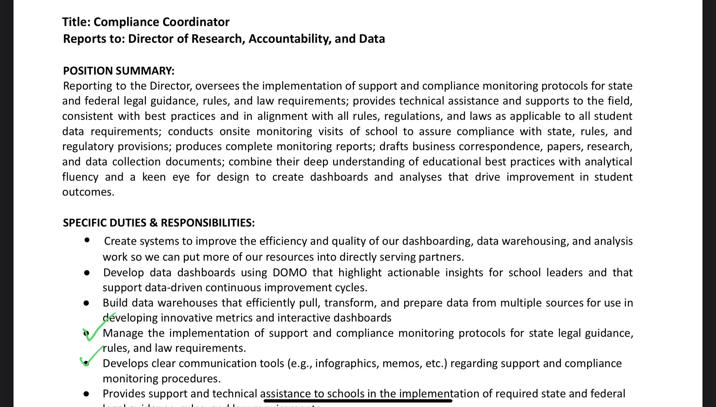 Upon further review, looks like they’re hiring someone to .. make dashboards? The top three job duties are building dashboards and doing work that is closer to what I would call Data Engineer or Data Scientist. I’ve spent time working in both data science and compliance and I’m not sure I’ve ever met someone capable of building data warehouses and also doing site visits for compliance.