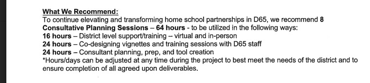 District 65 bought 64 hours (boiled into eight planning sessions). That comes out to $500/hour. For context, my consulting rate is $250/hour (my firm does machine learning and AI for corrosion mitigation). Scholastic's rate is high but not outside the wheelhouse for a company of that size. I've seen higher!