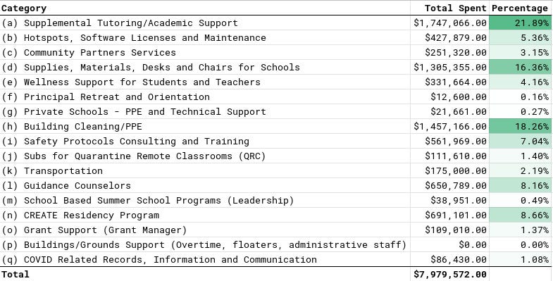 The District reported in the 11/2/2022 meeting where the funds are going. Their reporting wasn’t very transparent, so I’ve reformatted. You can view the raw spreadsheet here. Specifically, I aggregated the total spent along with the percentage of the funds.