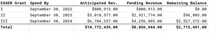 The COVID-relief funding came in three tranches, all tied to various federal legislation related to COVID. Remember the CARES act? Each of these three pieces of legislation resulted in funds to school districts which are called “ESSER grants.” ESSER funding is use-it-or-lose-it and they are required to spend the funds by a certain date. After that date, the funds are no longer available.