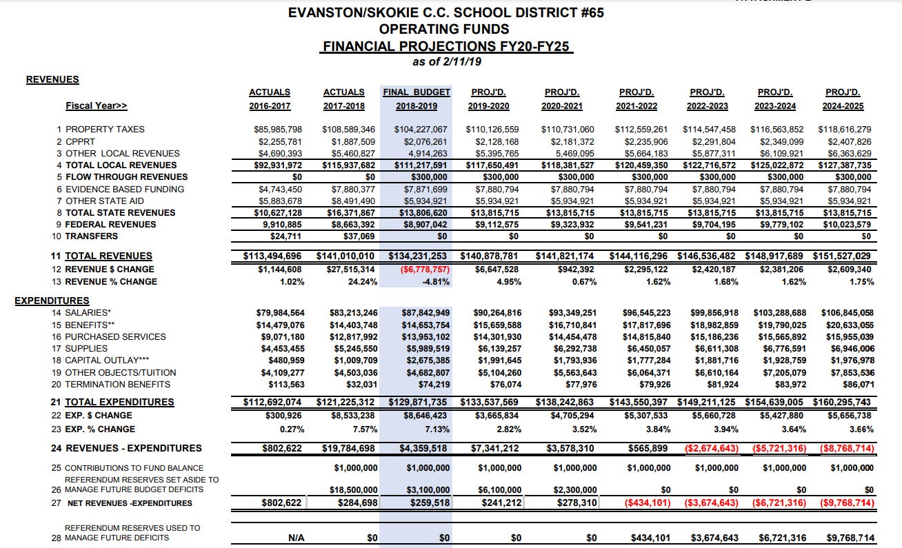 This can be a very dry subject, but stick with me here. I’m going to write a multi-part series on the impact of Federal funding on District 65. Let’s start here: It’s 2019 and COVID hasn’t happened yet. Let’s look at the financial projections from 2/11/2019: