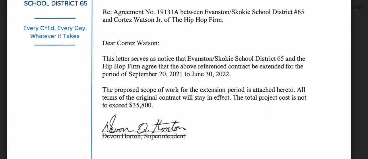 I received the contract back on December 12, 2022. This contract consisted of two parts. A first year for around $1,000 and a second year for $35,800. The second year involved 18 sessions in a classroom at Rice with students after school and a Saturday session and 6 sessions with staff. This contract was not presented to the School Board, despite the 105 ILCS 5/10-20.44 requirement to do so.