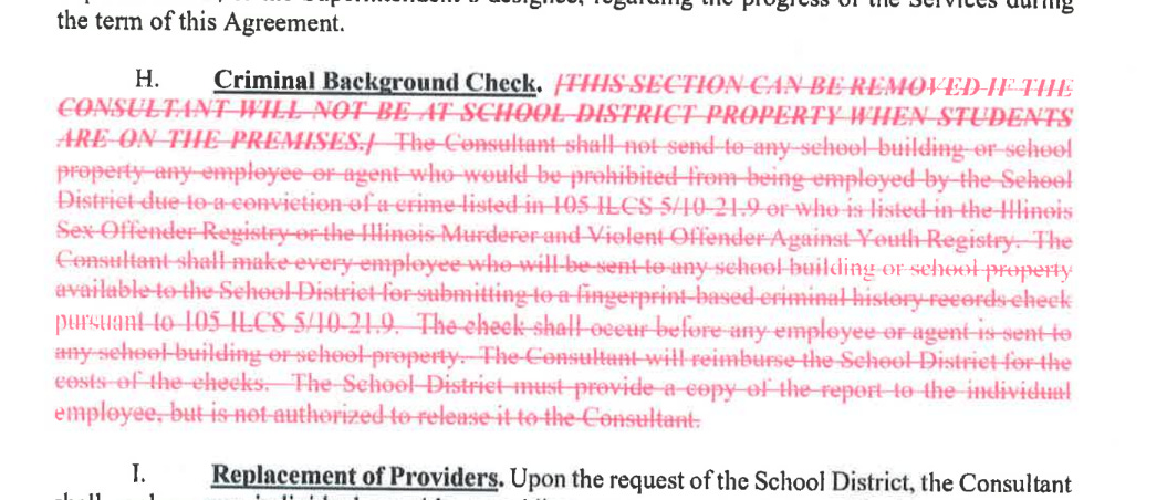 I have seen many contracts related to the school district and they’re almost always boilerplate consulting contracts, which include background checks and insurance requirements. In fact, I just got a FOIA request filled yesterday for a contractor doing professional development (not interacting with students at all) and there was a requirement for background checks. The background or insurance requirement was not red-lined.
