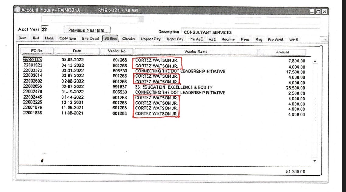 The School District also confirmed that this contractor fulfilled seven sessions with students, while his contract called for 22 sessions. Part of the contract itself calls for things like “Snack for program sessions ($150 per session) = $2700.00” Despite this, the District paid out the contract in full, over $35,000. I have sent a follow up email to the District to address this question, and I will post a follow-up when it comes in.