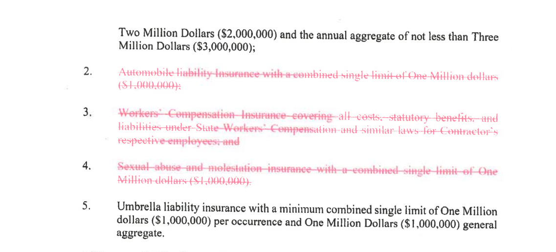 The first thing I noticed upon reading the contract is that the requirement for background checks were red-lined from the contract. You can view the redlining below.
