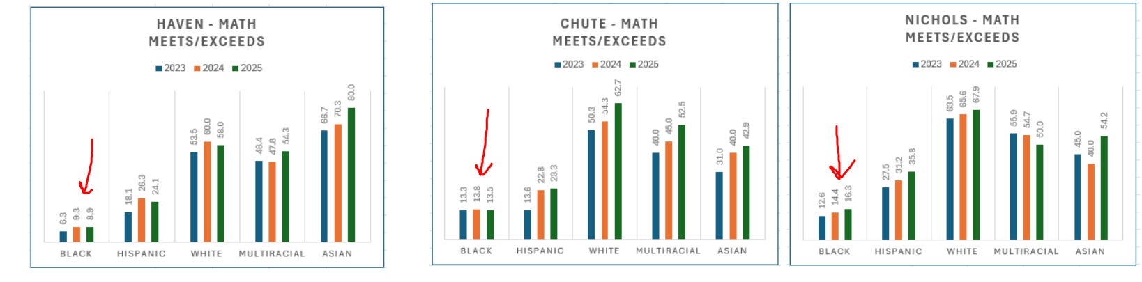 Chute has had some success as well. Between 2022 and 2025, the percentage of Black students reaching or exceeding proficiency increased from 22% -> 39%. The absolute numbers at Haven remain low, but have increased in 4 years from 6% (yikes) → 19% meeting or exceeding.