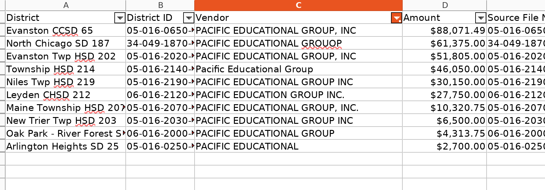 The first dataset I make available is a digitized version of all Illinois School Districts (excluding CPS) Annual Statement of Affairs Vendors (view file). This contains a list of any vendor who did any work with any District in Illinois. It’s useful if you want to search for a specific vendor and see if they worked for other Districts.1