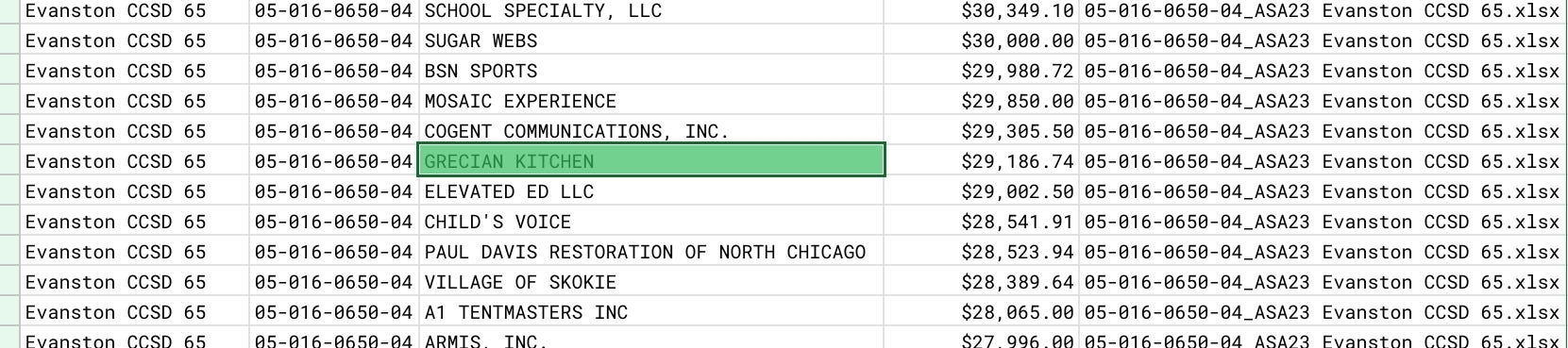 On this spreadsheet, there are also tabs for District 65 and ETHS (District 202). These reflect all payments made to vendors from either District in SY20232. For instance, you can find in SY2023, District 65 spent $29,186.74 with the Grecian Kitchen.