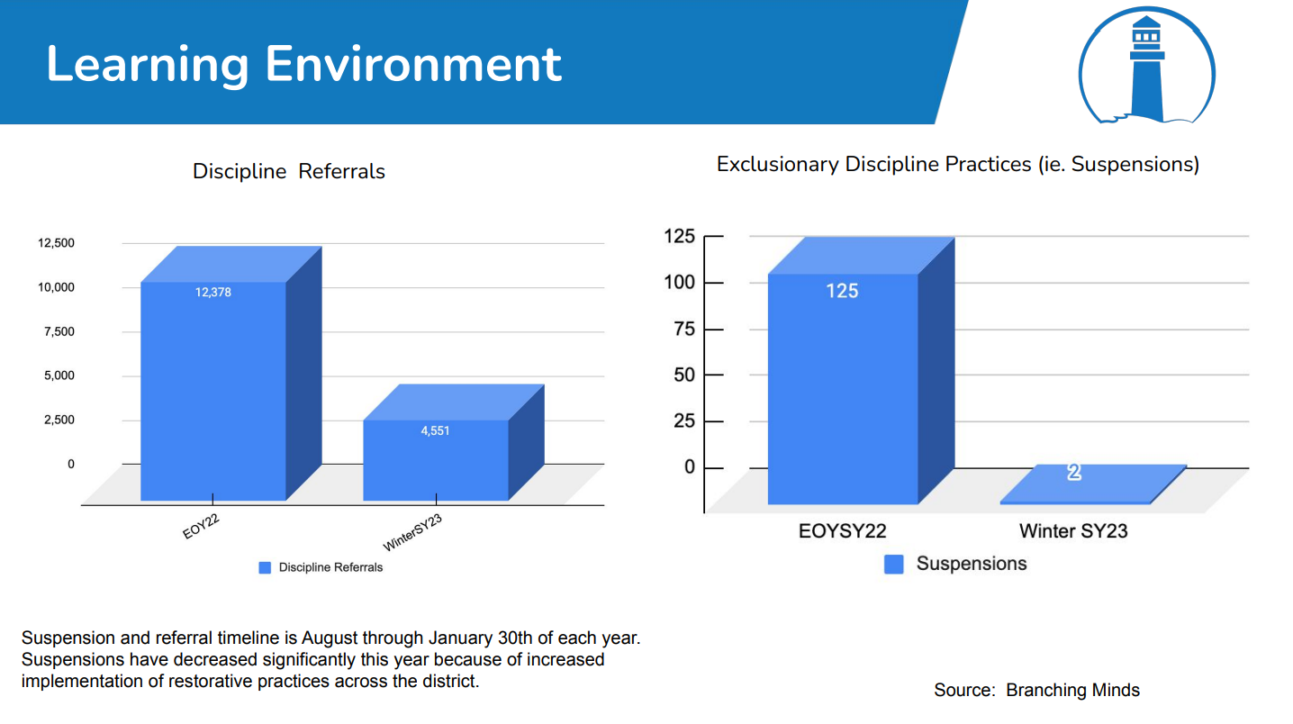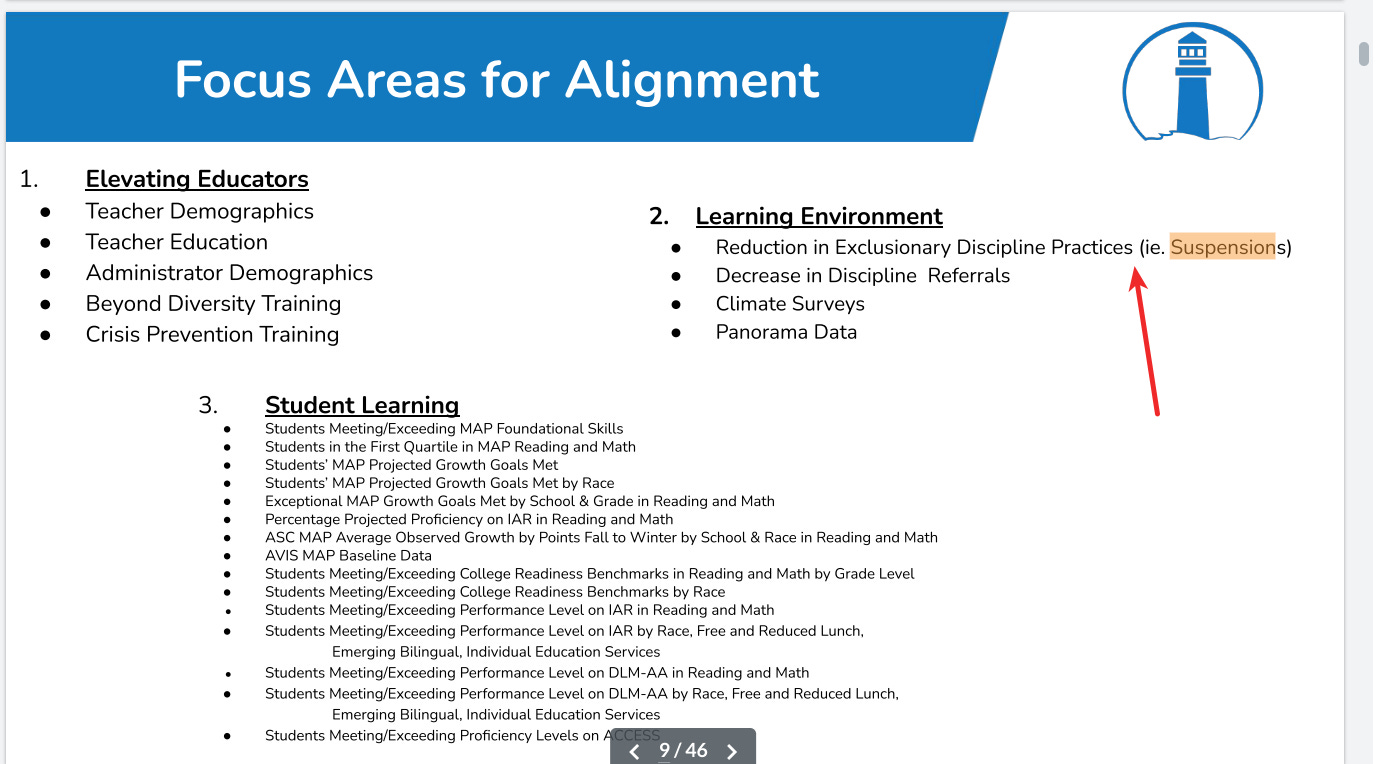 Suspensions is one of the District’s key metrics when it comes to establishing equity wins. You can see this on a slide in the Feb 2023 board meeting.