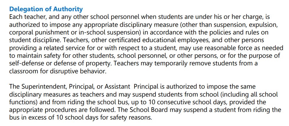 Consider the following from 2017-18 Student Handbook, which is a quite strongly worded delegation of authority. As a parent, I can see why this is intimidating. But, at the same time, I want the buck to stop with someone who is ultimately responsible. That person should be the School’s Principal; this document essentially captures that.