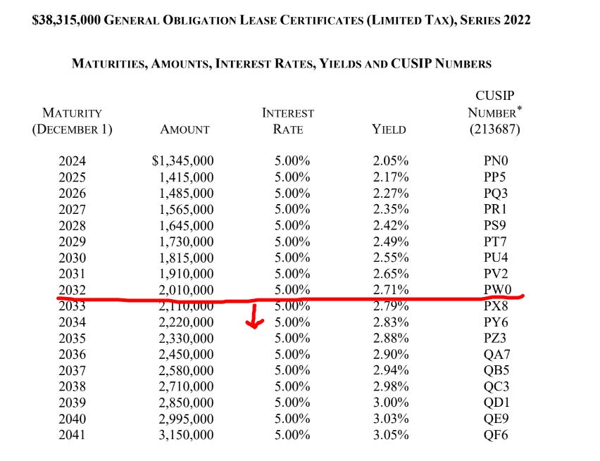 It’s not clear to me why these do not not line up. The Board did not pass a resolution to approve a lease certificate with limited redemption, they passed a resolution to approve a certificate with full early redemption. So the certificate doesn’t really even match their own resolution. Sometimes I wonder if the District’s lawyers or financial advisors or the Board or literally anyone besides me even reads these things.