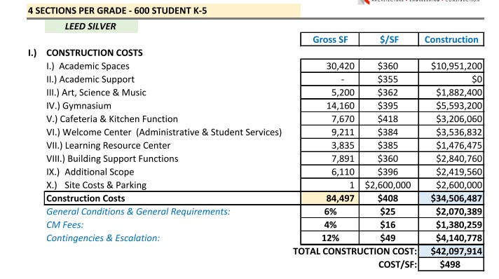 They are cutting it really close. In the past few weeks, I’ve spoke with multiple people in the construction industry who have told me that $498/sq ft for a school is on the low end. With that said, the Lincoln Junior High School in Skokie is 124,800 square feet, began work in 2020, and cost $44.6 million or $356/square foot. But the comparison is kind of apples-and-oranges because at 124,800 square feet, you get economies of scale.