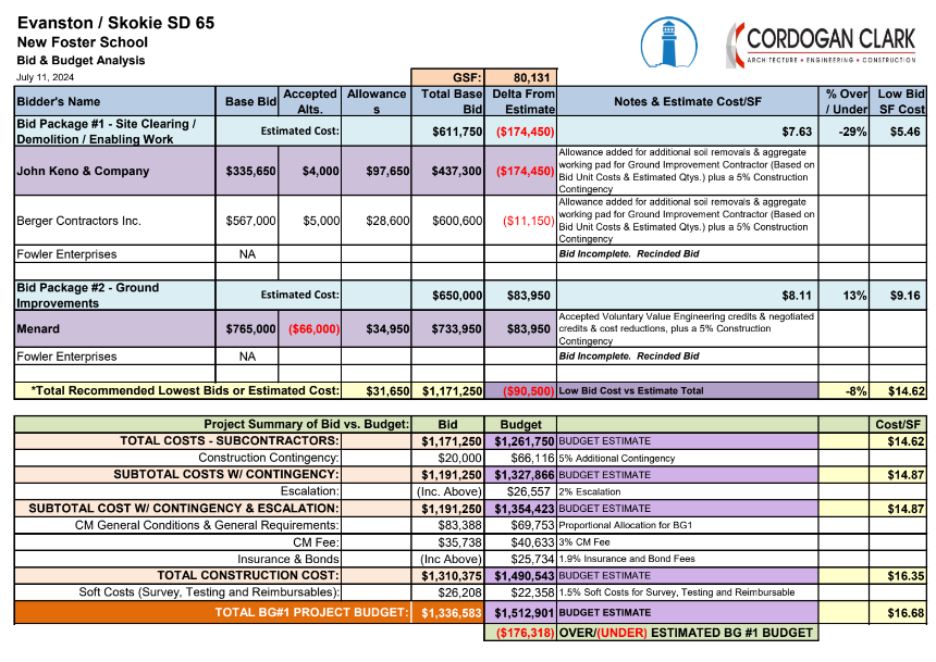 A summary of the bids is available in this document, provided by Cordogan Clark. The high level part is included in the image below, which shows the bids coming in about $176,318 under budget (or about 11%).