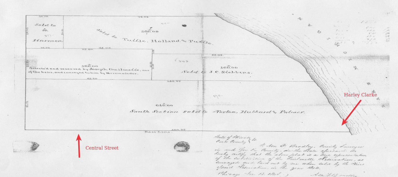 By 1876, the Reese Map of Evanston shows the land subdivided into lots. Interestingly, the Grosse Point Lighthouse, which was completed in 1873 is not included on this map. But you can see the land where Harley Clarke stands was split into strips coming off the Lake.