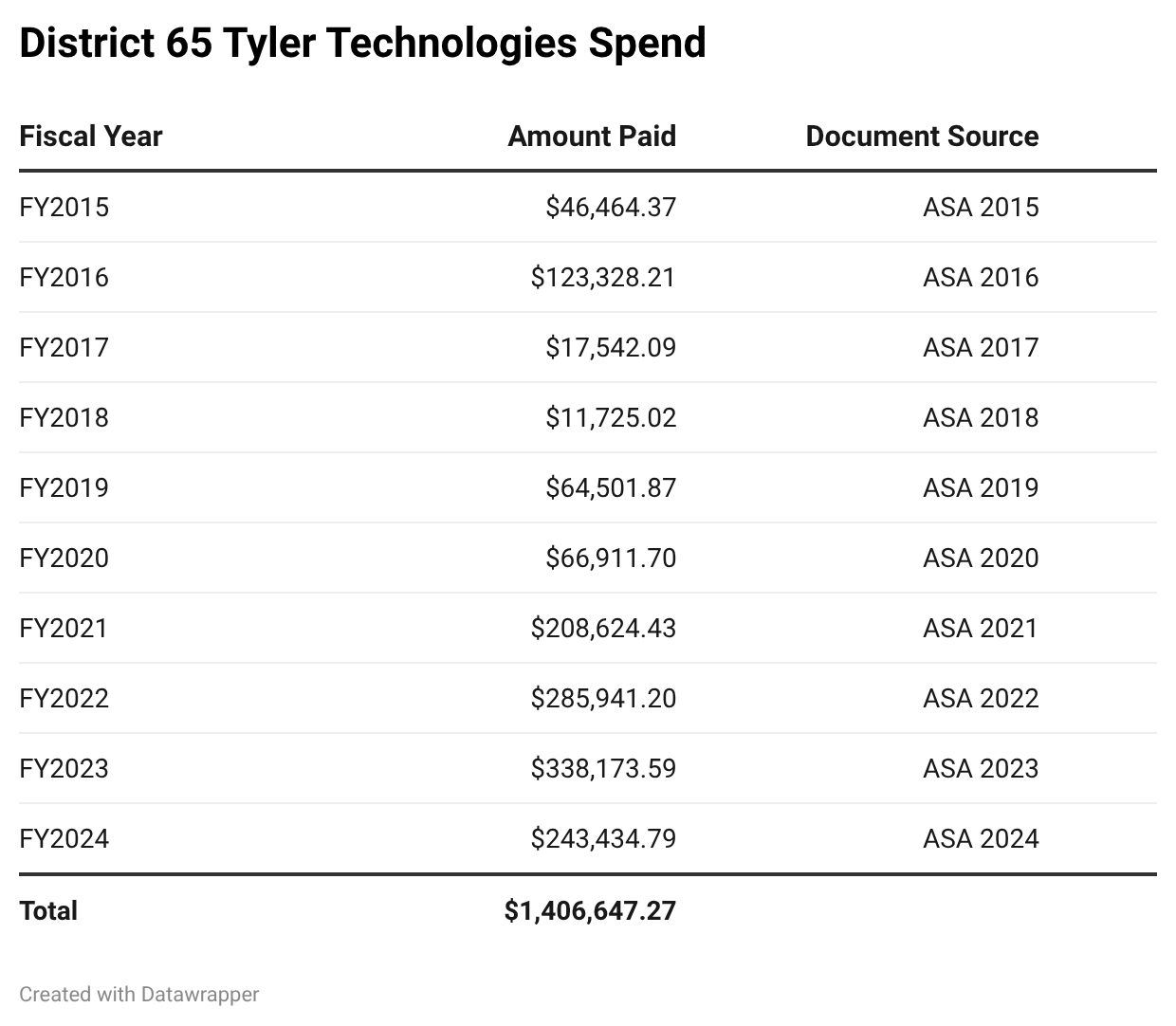 This is a direct result of Cook County’s late and over budget $250M+ migration to Tyler Technologies. Tyler is also a vendor to District 65 and you may remember them as the firm blamed for late payroll to teachers in Evanston and Dekalb County, Georgia in 2024. Over the last ten years, District 65 has paid Tyler more than $1.4 million.