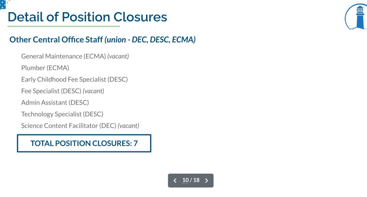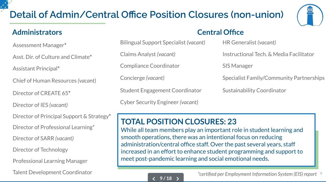 Mr. Ortiz’ job was listed on the eliminated central office positions in the last finance meeting. The below slides are from Dr. Grossi’s presentation;