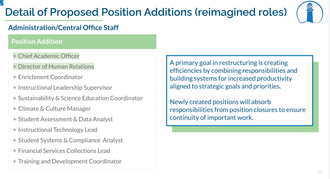 Not all these positions were eliminated, some are being reimagined and those roles are listed on the District Careers Website. For instance, the Sustainability role, which previously did “concrete things, like light bulbs” is now combined with a Science Education Coordinator as an administrative central office role.2