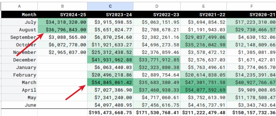 I had someone go through all the District 65 financial reports and digitize revenue figures for me. In general, it seems like revenue comes in when the Cook County taxes are due. In 2024, it was due March 2024 and August 2024.
