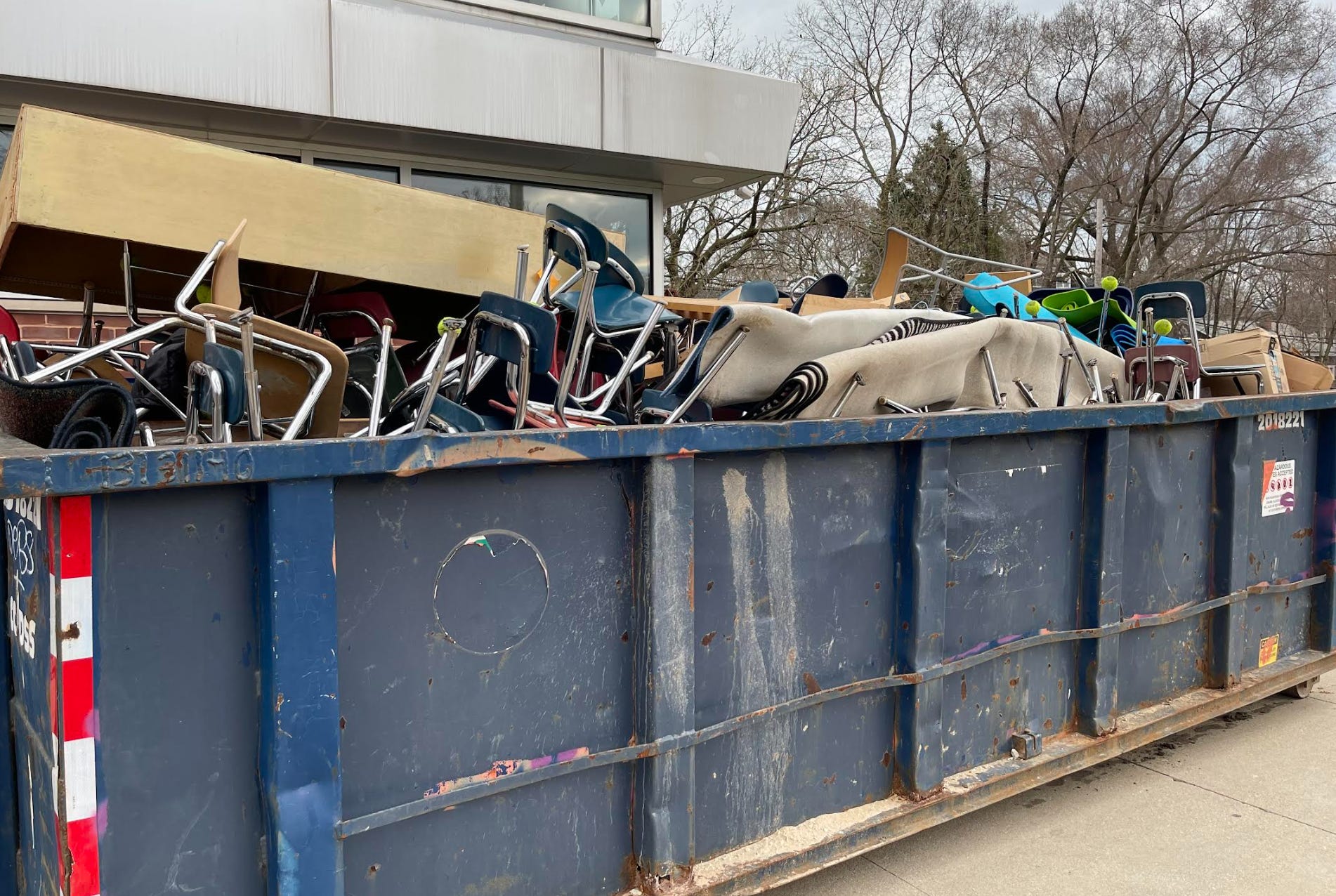 Some of the units flooded during the last two years, causing mold to build up on the contents, trashing the content inside. One school (Dewey) held a fundraiser to replace the contents before the District eventually did replace some contents.1 Below is a photo of contents removed from one of the shipping containers. You’ll see the trashed contents include chairs, rugs, bookshelves, and boxes.