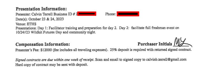 His speakers fee is not cheap, about $12,000 for a talk. He’s charged the same rate to ETHS, Niles, Mundelein, and Mount Prospect school districts for his speaking. Sometimes he’ll do multiple talks over a couple days to different groups. Here’s an example invoice from 2023.