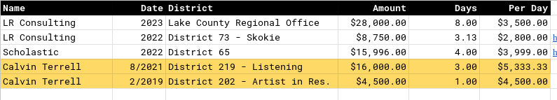 This is high but not outside the realm of reasonable for a speaker. For instance, I wrote about District 65 paying a speaker $8,500. I was critical of District 65 at the time and folks reached out to me to tell me I was wrong, and I agree, I was wrong. $8,000 or $10,000 for a speakers fee is not crazy, especially since these fees generally do not include travel expenses. As a consultant myself, I can do the math and say, “Well, I lose half that to taxes and then a big chunk to my insurance and then I have to pay my own travel so, my final margin is 10-15% at most, which is not very good”
