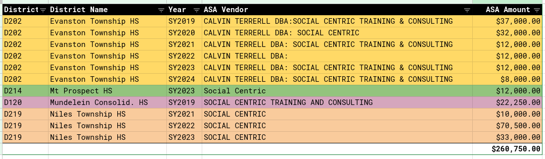 Second, I think her critique is fair. School Districts sign no bid contract on all sorts of stuff that are much more expensive than this with almost no challenge. Why this? Was it because of his race? For instance, ETHS spent $64,000 on a wellness app owned by the daughter of a (white) donor, and I was the only one who wrote about it. My gut is that it has less to do with Mr. Terrell’s race and probably more to do with his easily searchable social media takes.
