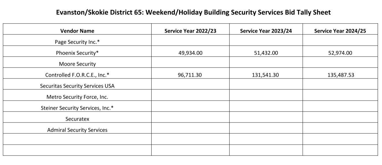 I am pleased to report that in the January 30, 2023 finance committee, the District went through the process to evaluate security vendors for holiday/vacation hours at school buildings. This was published in the committee meeting agenda and is available to the public. You can read the January 30, 2023 Meeting Agenda at this URL.