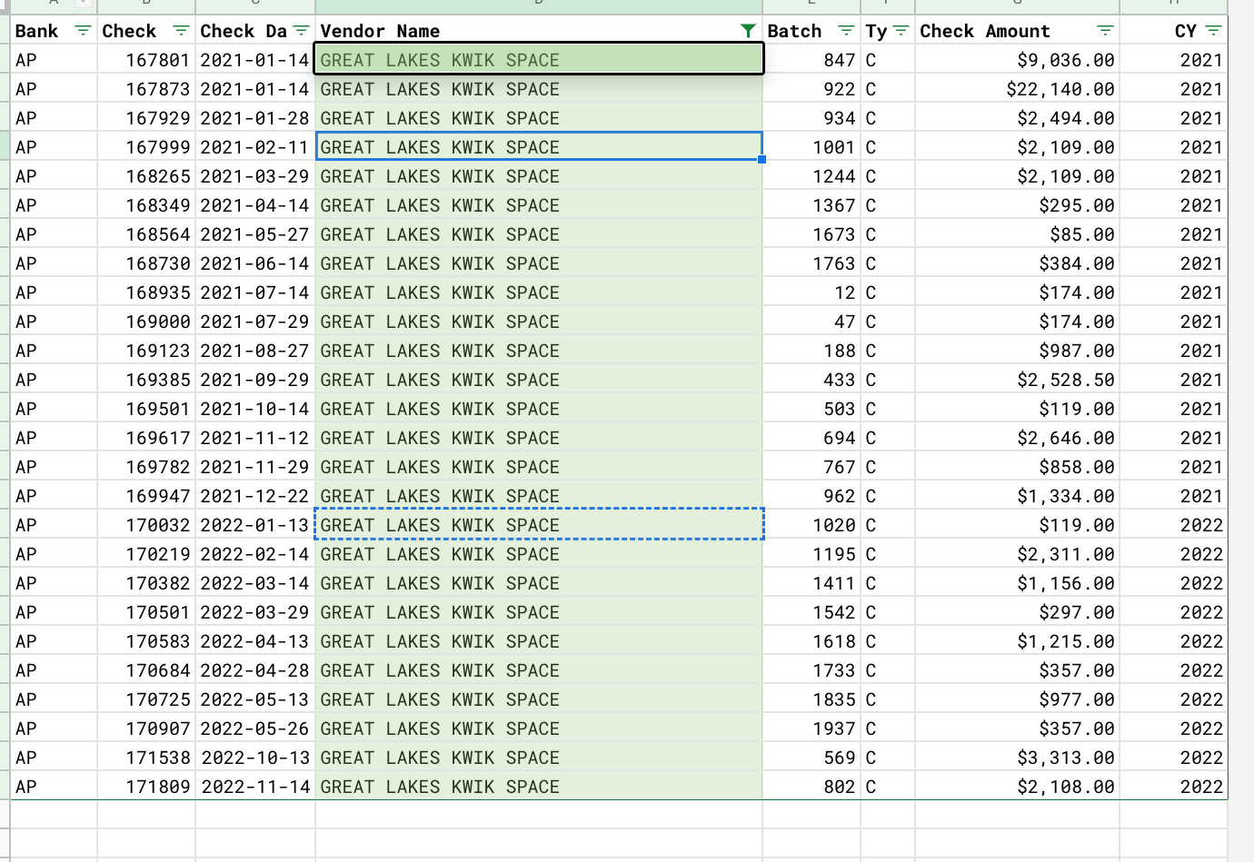 The containers are provided by Great Lakes Kwik Space, an Aurora-based provider of shipping container solutions. Over the last two years (January 2021 to November 2022) the District has paid this vendor $59,682.50.