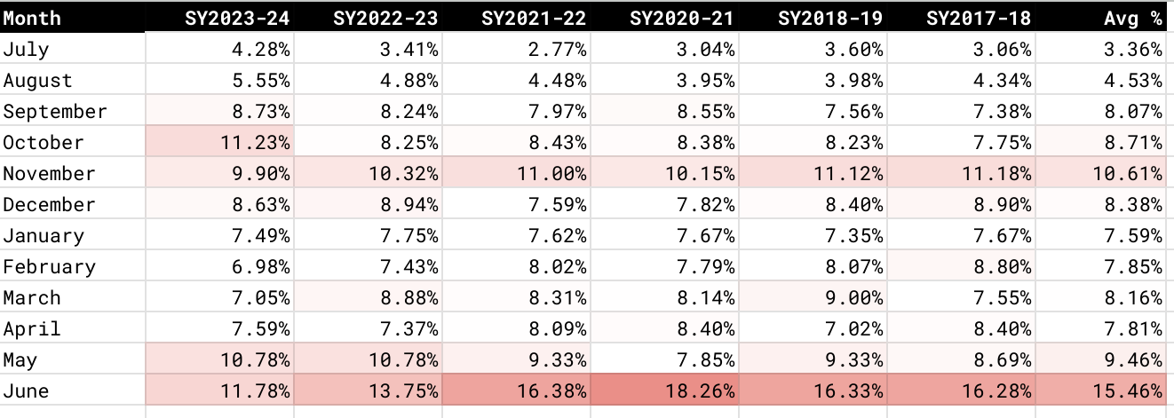 For District 65 it looks like the below table (excluding the COVID year). You read this: on average, in July of the fiscal year, 3.36% of the annual expenses are paid. Meanwhile, in the last month of the year, June, 15% of annual expenses come in. Costs are very uneven because of things like payments to vendors related to students being in school and lump sum payments to teachers for the Summer (in June).