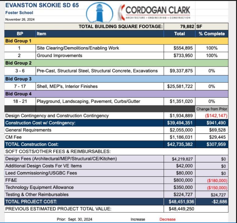 Tonight, the District 65 Board will be voting on $23 million worth of costs tonight for the Foster School. You can view the document from Cordogan-Clark here. This bid package consists of the bulk of construction costs from electrical, to plumbing, to HVAC for the Foster School. I’ve highlighted the packages in yellow below.