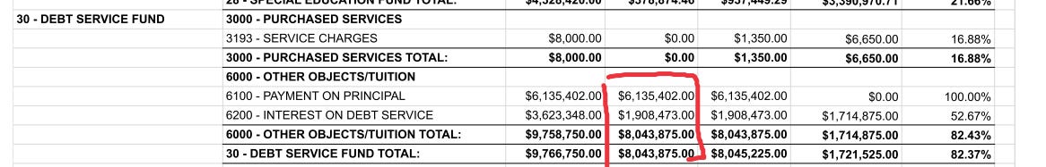 There is other debt included in the total $8 million dollar number paid, but if you look at last November, District 65 paid $4.25m in payment on principal debt service and this year $6.13m - a difference of about $1.87m - or about half the lease certificate annual payment. You could chop that out of the November number for this year if you wanted to to compare apples to apples operational expenses - but I think you should leave it in - it’s a real cost to consider for the next 17 years.