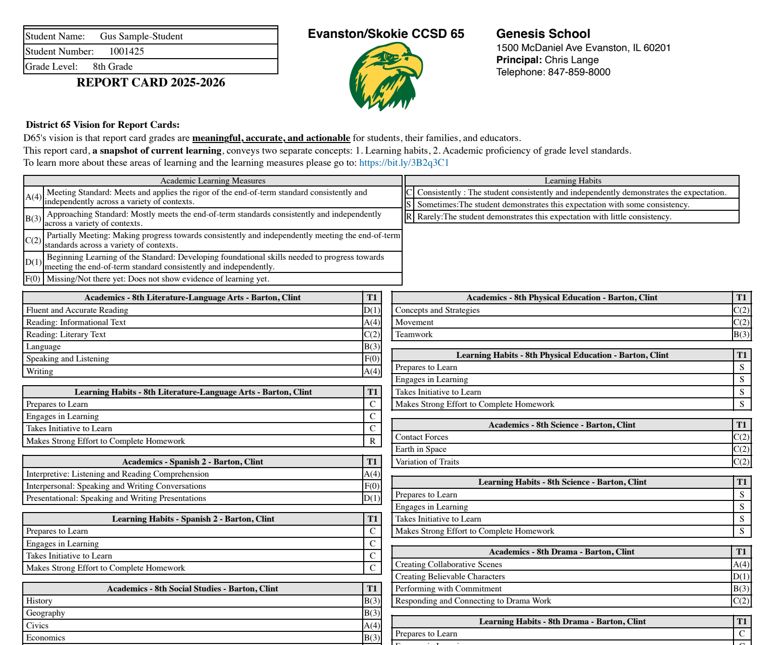 Around 2020, in the early Horton years, District 65 started implementing standards based grading. You can read the whole history in this memo from 2024. It took almost five years of surveys, committees, meetings, and software modifications. You can see a sample 8th grade report card below or on these teacher training slides: