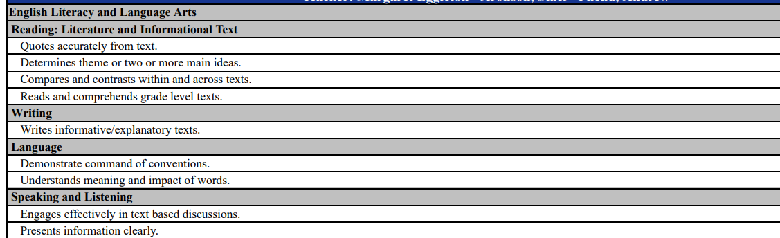 This is fine .. but what if they don’t line up? How am I supposed to know whether the student is learning the content in its entirety? Maybe this works out for 8th grade physics but look at the fifth grade ELA categories: