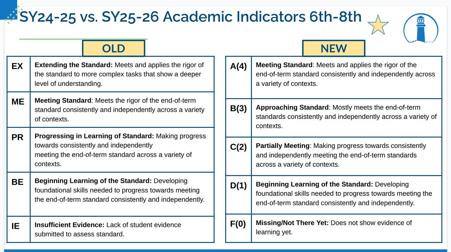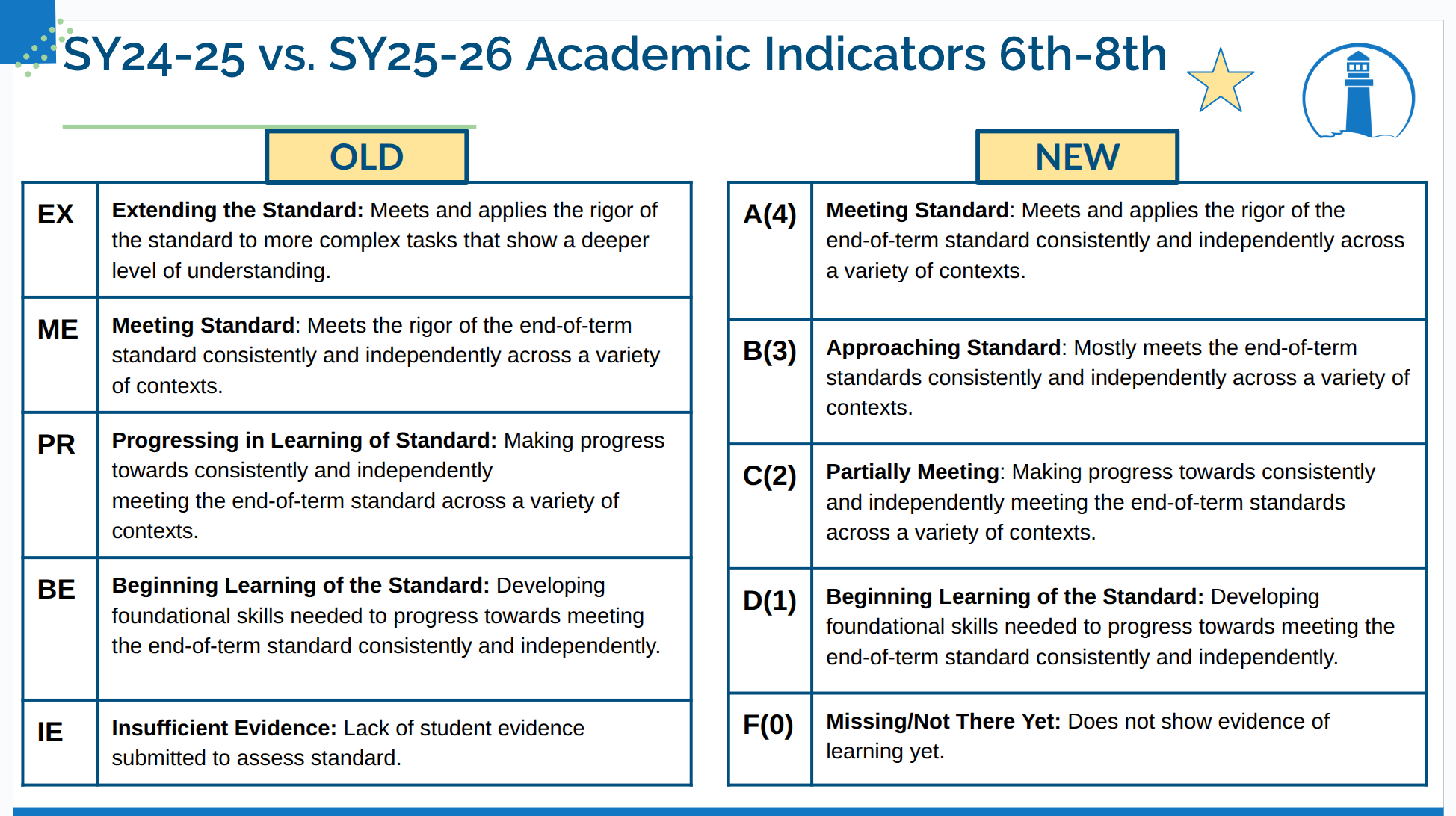 This isn’t the first change. Middle school parents may be familiar with the total overhaul of moving from EX/ME/PR/BE/IE .. back to an A-F system, in order to align with high school and college.