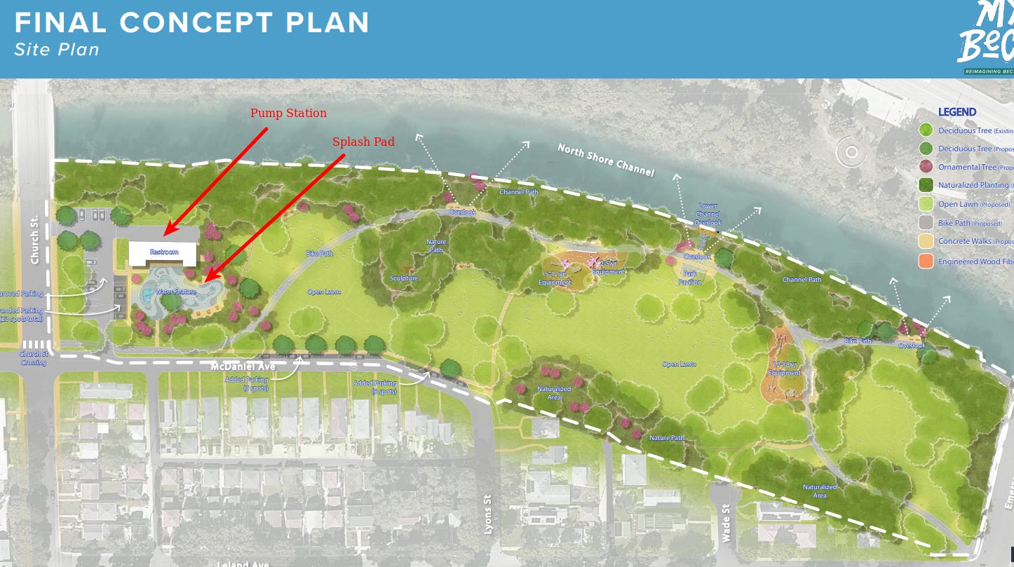 At the end of 2023, the City did engage in a process with a consultant to explore expanding Beck Park onto this property. You can read some of the meeting notes here. The new plans do include a splash pad / water feature at this location, along with the extension of Beck Park to Church Street.
