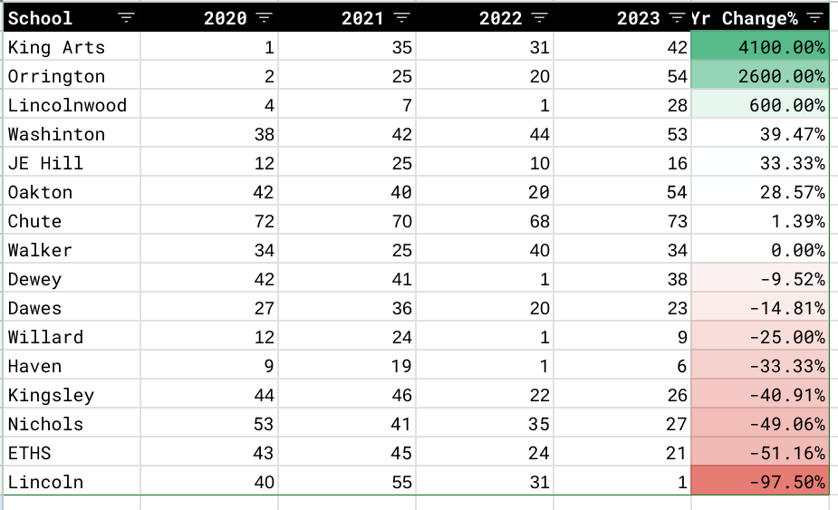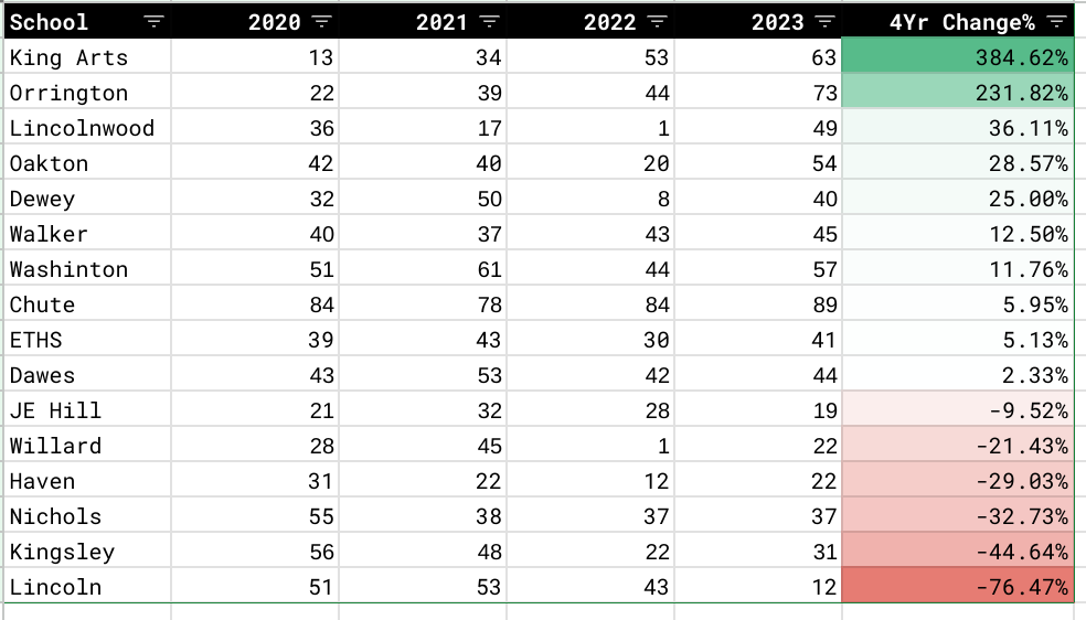 I would say that this is the most heart-breaking result. Some schools saw big increases but only because the numbers in 2020 were so bad. In the last four years, most Evanston schools generally saw a decline in the degree to which teachers reported being committed to the school.